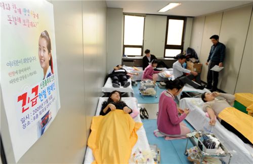 신종인플루엔자 확산에 따른 단체 헌혈이 급감으로 수혈용 혈액 부족을 겪고 있는 가운데, 기획재정부가 16일 과천청사에서 전 직원을 대상으로 한 '사랑의 헌혈' 행사를 하고 있다.