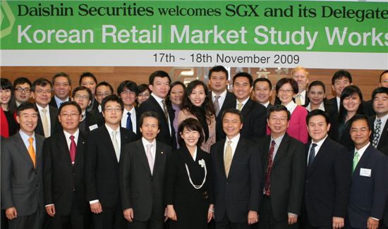 $pos="C";$title="";$txt="싱가포르 증권업계 관계자들이 증권연수에 앞서 대신증권 11층 강당에서 기념 촬영하는 모습. 사진은 이어룡 대신증권 회장(앞줄 왼쪽에서 다섯번째), 노정남 대신증권 사장(앞줄 왼쪽에서 네번째), 푸후아 시에 싱가포르 증권거래소 대표(오른쪽에서 네번째), 와통 림 싱가포르 증권업협회장(오른쪽에서 세번째).";$size="550,325,0";$no="2009111715370220573_1.jpg";@include $libDir . "/image_check.php";?>[아시아경제 박선미 기자]싱가포르 증권업계 관계자들이 한국 증권산업의 리테일 부문 경쟁력을 배운다.