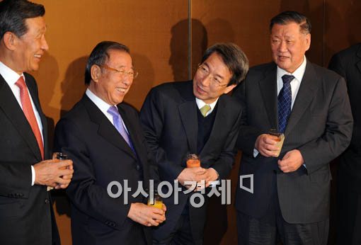 [아시아경제 윤동주 기자] 정운찬 국무총리가 17일 서울 소공동 롯데호텔에서 열린 전경련 회장단 회의에 참석해 조석래 전경련회장 정몽구 현대기아차회장과 얘기를 나누고 있다.