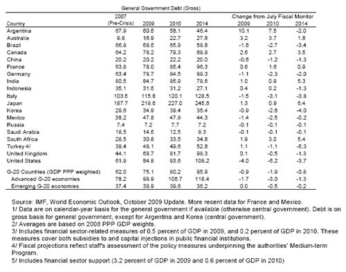 23일 IMF의 ‘11월 국가별 공공재정 현황(The State of Public Finances Cross-Country Fiscal Monitor: November 2009)’ 보고서에 따르면, IMF는 우리나라가 효율적인 재정정책에 힘입어 주요 20개국(G20) 가운데 사우디아라비아, 러시아와 더불어 2014년에 재정수지 흑자를 기록할 것으로 분석했다.