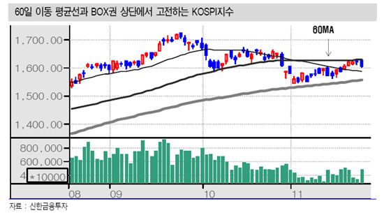 전날 코스피 지수는 60일 이동평균선에 거의 근접한 후 다시 약세로 돌아섰다. 그만큼 60일 이평선의 저항이 강하다는 뜻이며 국내증시의 체력이 약하다는 얘기다.