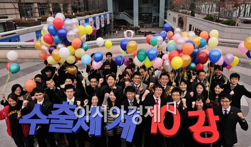 [아시아경제 윤동주 기자] 무역의날을 앞두고 27일 오전 서울 강남구 삼성동 무역협회앞 광장에서 무역인들이 '수출세계10강'을 축하하며 파이팅을 외치고 있다.