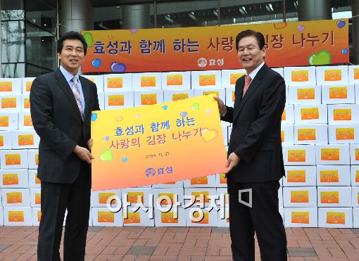[아시아경제 김현정 기자] 효성은 27일 오후 마포구청에서 이상운 효성 부회장과 신영섭 마포구청장이 참석한 가운데 사랑의 김장김치 전달식을 갖고, 마포관내의 저소득층 1500세대에 김치를 전달했다. 사진은 신영섭 구청장(왼쪽)과 이상운 부회장이 전달식 후 기념촬영을 하고 있는 모습.