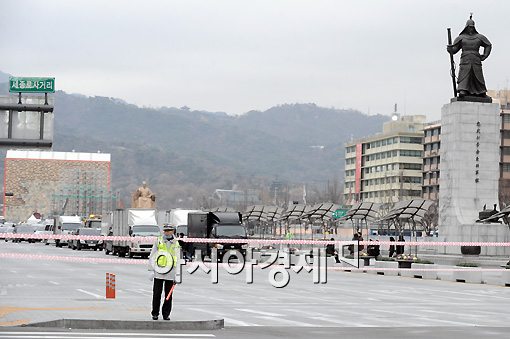 [아시아경제 이기범 기자] 29일 오전 서울 광화문 광장에서 KBS 드라마 '아이리스' 대규모 총격신 촬영으로 광화문 광장에 차량 출입이 통제되고 있다.