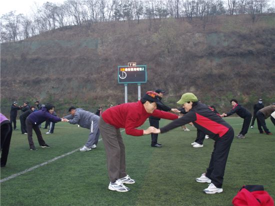 [아시아경제 박종일 기자]성북구민 걷기대회가 28일 오전 7시 성북구 내 8개 건강걷기코스에서 열린 가운데 오동근린공원 코스 참가자들이 걷기대회 후 월곡 인조잔디구장에서 마무리 운동을 하고 있다.