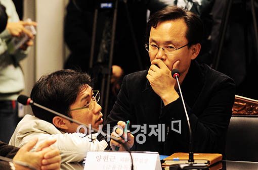 회의에 참석한 한 금융감독원 관계자가 심각한 표정으로 회의 시작 전 의견을 나누고 있다.
