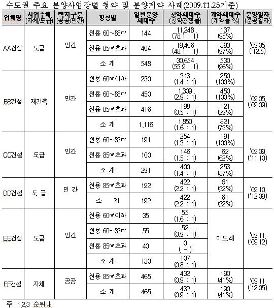 이같은 과다한 주택 공급으로 최근 분양된 수도권 7개 지역의 사례조사 결과 계약률이 40%에 못미치는 사업장들이 곳곳에서 발생한 것으로 집계됐다. 또 분양과 동시에 착공했으나 분양대금에 비해 건설비로 투입해야 할 비용이 더 많아, 건설업체의 자금난이 더욱 심화됐다고 장박사는 분석했다.