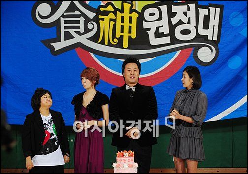 [아시아경제 박성기 기자]30일 오후 서울 대치초등학교에서 진행된 MBC드라마넷 '식신원정대' 100회 특집 녹화에서 김신영, 이파니, 정준하, 현영이 사회를 보고 있다.