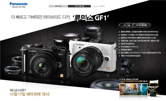 루믹스 GF1은 오는 17일부터 파나소닉코리아 웹사이트를 통해 선착순으로 예약 구매할 수 있다. 파나소닉은 예약판매를 신청한 고객들에게 이날 개봉하는 영화 아바타의 영화예매권과 경품 등을 증정할 계획이다.