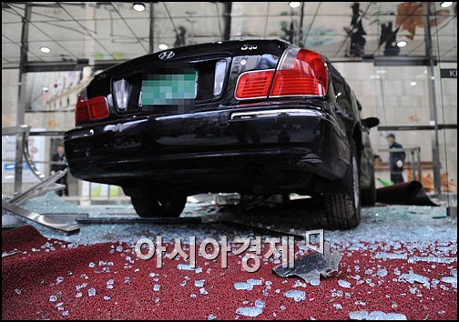 [아시아경제 박성기 기자]1일 오후 3시50분께 서울 여의도 국민은행 본점에 검은색 그랜저XG 차량이 정문을 들이받는 사고가 발생했다.