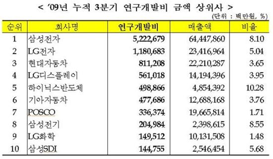 연구개발비 금액이 가장 높은 곳은 5조2227억원을 기록한 삼성전자였으며 LG전자(1조1807억원)가 2위, 현대자동차(8112억원)와 LG디스플레이(5610억원)가 각각 3·4위를 차지했다.