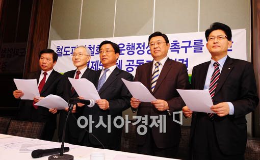 [아시아경제 윤동주 기자] 경제5단체 부회장단은 3일 오전 서울 팔레스 호텔에서 철도노조 파업 장기화에 따른 물류대란으로 국가 경제에 악 영향을 초래하지 않도록 파업을 철회하고 현업에 복구해줄 것을 촉구하는 긴급 모임을 갖고 있다.