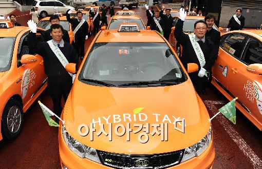 [아시아경제 이재문 기자] 연료비가 절반밖에 들지 않는 하이브리드 택시가 서울시내에서 운행된다. 3일 오전 서울시청별관에서 열린 친환경 LPi하이브리드 택시 발대식에서 10대의 시범운행차량 기사들이 손을 흔들고 있다.