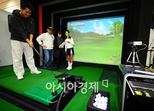 전시장을 찾은 관람객들이 발명대전 금상을 수상한 골프존의 '모의 골프시스템 센서장치'를 체험해보고 있다.