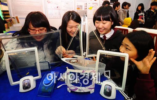 [아시아경제 윤동주 기자] 3일 서울 강남구 삼성동 코엑스에서 열린 '2009 대한민국 발명대전'을 찾은 관람객들이 한 음향업체에서 개발한 종이 스피커를 신기한 듯 바라보고 있다.