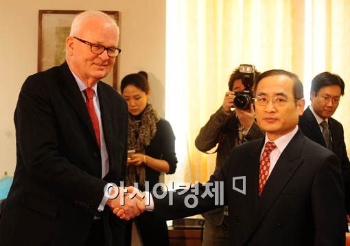 [아시아경제 윤동주 기자] 보즈워스 미 대북정책 특별대표가 8일 방북에 앞서 7일 오전 서울 세종로 외교부청사에서 위성락 한반도평화교섭본부장을 만나 악수를 나누고 있다.