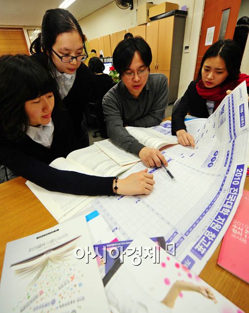 [아시아경제 윤동주 기자] 2010학년도 대학수학능력시험 성적 통지표가 배부된 8일 오전 서울 종로구 배화여고 3학년 진학 교사가 학생들에게 진학 상담을 하고 있다.