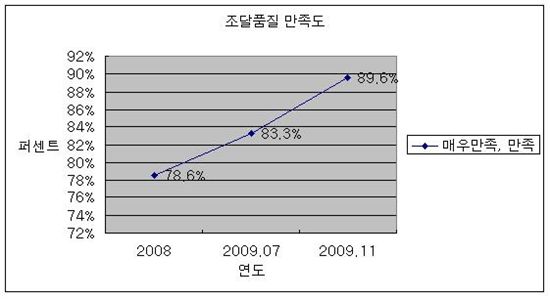 이는 지난해 78.6%, 올 상반기 83.3%보다 조달물품 품질만족도가 꾸준히 높아지고 있음을 보여 주고 있다.
