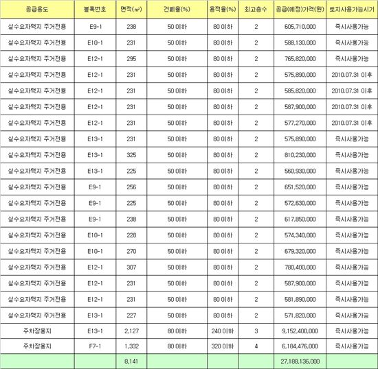 경쟁입찰로 공급되는 주차장 용지 2필지 또한 근린생활시설 및 근린상업용지 인접지역에 위치하고 있어 향후 유효수요를 감안할 때 투자가치가 높은 입지여건을 갖추고 있다. 예정가격은 ㎡당 430만~460만원 선이다.