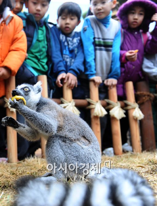 [아시아경제 이재문 기자] 11일 오후 서울동물원에서 열린 '따뜻한 서울동물원 겨울여행' 축제에서 알락꼬리원숭이가 과일을 먹으며 관객들을 맞이하고 있다. 서울동물원은 동물들을 위한 난방시설을 물론 관람객을 위한 동물해설가 셔틀버스도 운행한다.