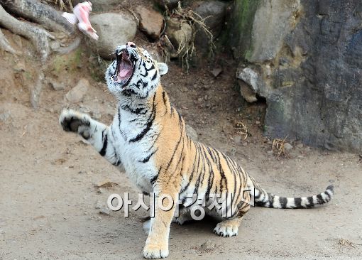 [아시아경제 이재문 기자] 11일 오후 서울동물원에서 열린 '따뜻한 서울동물원 겨울여행' 축제에서 호랑이가 먹이를 받아먹고 있다. 서울동물원은 동물들을 위한 난방시설을 물론 관람객을 위한 동물해설가 셔틀버스도 운행한다.
