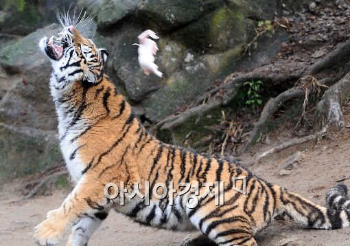 [아시아경제 이재문 기자] 11일 오후 서울동물원에서 열린 '따뜻한 서울동물원 겨울여행' 축제에서 호랑이가 먹이를 받아먹고 있다. 서울동물원은 동물들을 위한 난방시설을 물론 관람객을 위한 동물해설가 셔틀버스도 운행한다.