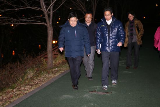 [아시아경제 박종일 기자]날씨가 추워지면서 맹정주 강남구청장이 지난 11일 야간에 양재천을 구석구석 살펴 산책과 운동하는 시민들에게 불편을 주는 곳을 발견하고 즉시 개선토록 관계자들에게 지시했다.