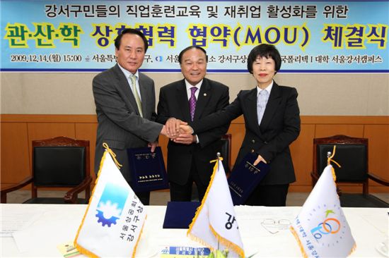 [아시아경제 박종일 기자]14일 오후 3시 구청 3층 대회의실에서 김재현구청장(중앙)과 송진수강서구상공회장(왼쪽), 이종남한국폴리텍Ⅰ대학학장이 관·산·학 상호협력 협약을 체결했다.