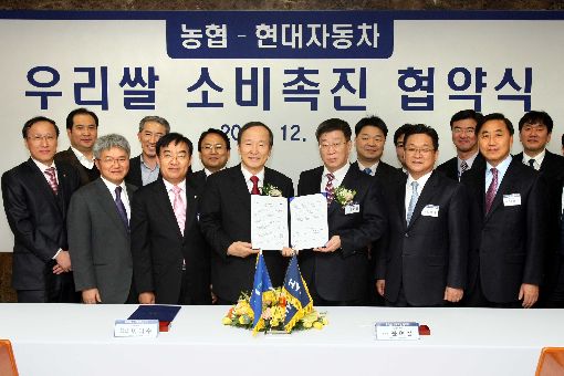 현대자동차(회장 정몽구)는 16일 서울 양재동 본사에서 윤여철 부회장과 이덕수 농협중앙회 농업경제대표이사 등이 참석한 가운데 우리쌀 소비촉진을 위해 공동으로 협력한다는 협약을 체결했다.