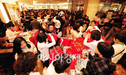 [아시아경제 이재문 기자]롯데백화점이 17일 오전 창립 30주년을 맞아 30번째 백화점으로 부산시 중구 중앙동에 롯데백화점 부산 광복점을 개점했다. 고객들이 재물이 들어온다는 의미의 빨간 속옷을 구입하고 있다.