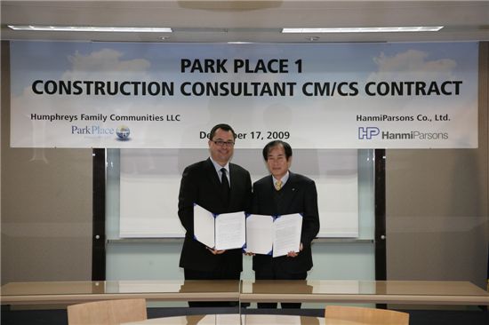 [아시아경제 오진희 기자]건설사업관리(CM) 기업 한미파슨스(대표 김종훈)가 서울 삼성동 본사에서 경기도 평택의 미군아파트 신축공사에 대한 CM 용역계약을 17일 체결했다