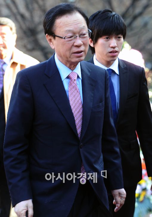 [아시아경제 이재문 기자] 18일 오후 서울 정동제일교회에서 열린 정몽윤 현대해상화재보험 회장의 장녀 정이씨와 김인규 KBS사장의 장남 현강씨 결혼식에 박희태 전 한나라당 대표가 참석하고 있다.