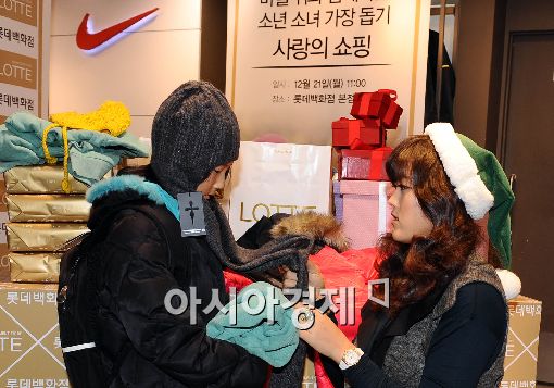 [아시아경제 이재문 기자] 프로골퍼 미셸위가 21일 오전 서울 소공동 롯데백화점 본점에서 열린 소년소녀가장돕기 사랑의쇼핑 행사에서 아이들에게 옷을 선물하고 있다. 미셸위는 이번 행사에 전남 장흥군 소년·소녀 가장 9명을 초청해 쇼핑을 같이하며 크리스마스 선물을 전달했다.