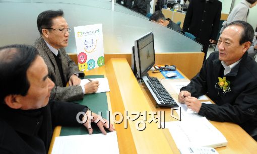 [아시아경제 이재문 기자] 김승유 미소금융재단 이사장이 21일 오후 서울 종로구 관수동에 개소한 하나미소금융재단에서 고객들의 고충을 상담하고 있다.