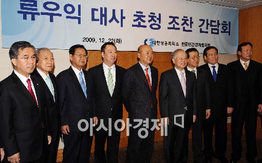[아시아경제 이재문 기자] 류우익 주중대사(왼쪽 다섯번째)와 손경식 대한상의(왼쪽 여섯번째) 회장이 22일 오전 서울 소공동 롯데호텔에서 열린 대한상의 조찬 간담회에서 참석자들과 기념촬영을 하고 있다.