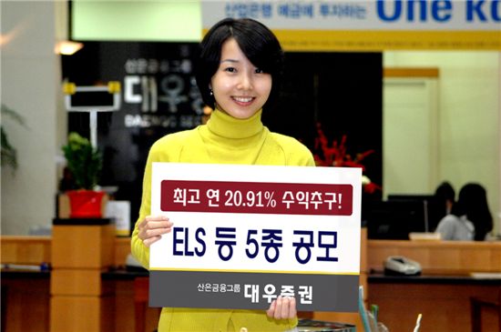 [아시아경제 김은별 기자]대우증권은 22일부터 ELS 5종을 공모한다. 총 500억원 규모의 이번 공모 상품은 최고 연 20.91% 수익을 추구하며 각각 KT 현대중공업 KOSPI200 HSCEI 삼성화재 LG디스플레이 현대차 삼성전기 외환은행 두산중공업 등을 기초자산으로 한다.