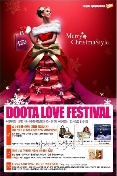 [아시아경제 김현정 기자] 패션전문점 두타에서는 크리스마스와 연말연시를 맞아 22일부터 내년 1월 3일까지 '두타 메리 크리스마스타일 러브 페스티발'을 진행한다.