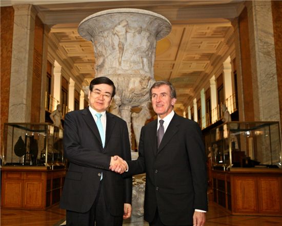 $pos="C";$title="";$txt="조양호 한진그룹 회장이 세계 3대 박물관 한국어 작품 안내 서비스를 완성한 공로를 인정받아 22일 ‘환경재단’으로부터 ‘2009 세상을 밝게 만든 사람’ 상을 수상했다. 사진은 조 회장(왼쪽)과 닐 맥그리거 대영박물관장이 런던 대영박물관에서 열린 후원 협약식에서 협약서에 서명한 뒤 악수를 하고 있는 모습.";$size="550,441,0";$no="2009122211520182114_1.jpg";@include $libDir . "/image_check.php";?>