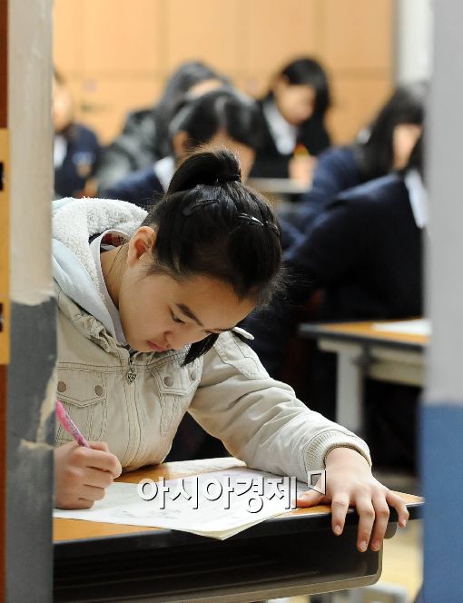[아시아경제 이재문 기자] 전국 중학교 1∼2학년을 대상으로 연합 학업성취도평가가 실시된 가운데 23일 오전 서울 종로구 배화여자중학교 학생들이 시험을 치르고 있다.