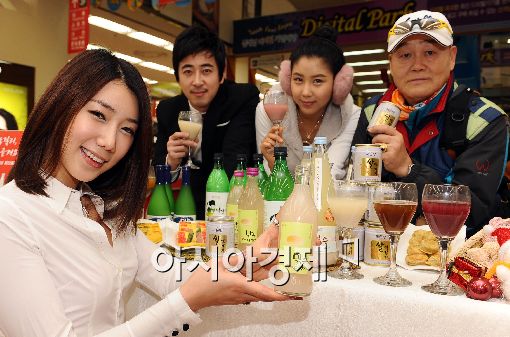 [아시아경제 이재문 기자] 국순당이 23일 롯데마트 서울역점에서 열린 '연령대별 송년모임 막걸리 제안' 행사에서 다양한 종류의 막걸리를 선보이고 있다.