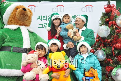 [아시아경제 이재문 기자] 23일 오전 서울 청계광장에서 열린 '그린산타가 전하는 선물' 이벤트에 참석한 하영구 씨티은행장이 그린산타가 되어 아이들에게 선물을 나눠주고 있다.