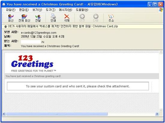 [아시아경제 김철현 기자]크리스마스 카드로 위장해 악성코드를 유포하는 이메일이 대량으로 발송되고 있어 사용자들의 주의가 요구된다.