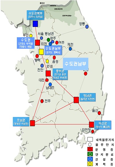 한편 5대 권역 내륙물류기지는 중부권(충북 청원?충남 연기), 영남권(경북 칠곡), 수도권(경기 군포?의왕), 부산권(경남 양산), 호남권(전남 장성) 등으로 구성됐다.