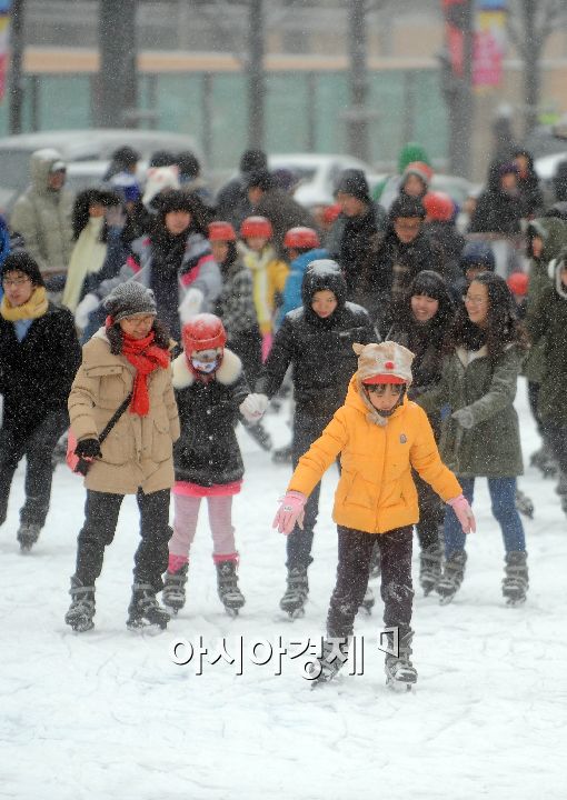 [아시아경제 이재문 기자] 서울과 경기 등 중부지역에 갑자기 많은 눈이 내리는 가운데 27일 오후 서울 광화문광장 스케이트장에서 시민들이 눈을 맞으며 스케이트를 타고 있다.