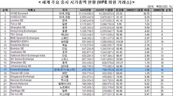 한편 49개 세계거래소연맹(WFE) 회원 거래소의 지난달 말 시가총액은 46조8020억달러로 지난해 말 대비 41.11% 증가했다. 거래소 관계자는 "세계 증시가 금융위기 돌파와 경기회복에 대한 기대감으로 큰 폭의 상승세를 기록했다"고 설명했다.