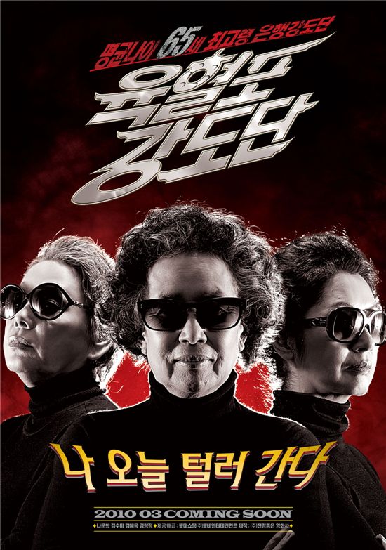 28일 오전 공개된 이번 포스터는 '평균나이 65세 최고령 은행 강도단' '나 오늘 털러 간다'이라는 카피문구와 함께 중견배우 나문희, 김수미, 김혜옥이 나란히 검정 선글라스에 검정 복장을 하고 있다.