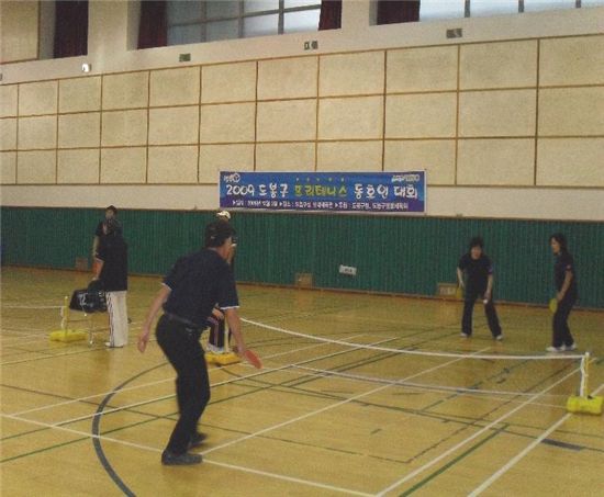 매주 목요일 오전 10~11시30분 도봉구청 지하 체육관에서 운영하는 프리테 니스는 탁구와 테니스의 다이나믹한 동작이 결합된 신종 스포츠로 테니스에 비해 라켓이 짧고 코트가 작아 남녀노소 누구나 가볍게 즐길 수 있는 생활체육이다.