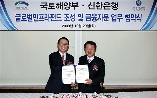 [아시아경제 박성호 기자]신한은행은 29일 오전 8시 서울 소공동 롯데호텔에서 이백순 신한은행장과 국토해양부 권도엽 차관이 참석한가운데 '글로벌인프라펀드'의 금융자문협약 및 내년 상반기 출범 예정인 '글로벌인프라펀드 2호'의 금융주간 협약을 체결했다고 밝혔다.