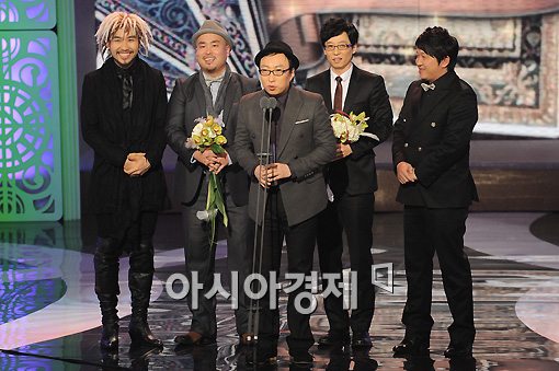 [아시아경제 고경석 기자]'무한도전' 팀이 29일 오후 10시 서울 영등포구 여의도 MBC 공개홀에서 개그맨 이혁재의 사회로 열린 '2009 MBC 방송연예대상'에서 PD상을 수상했다.
