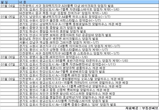 [아시아경제 오진희 기자]이번 주 분양시장은 청약접수 4곳, 당첨자 발표 9곳, 당첨자 계약 7곳, 모델하우스 개관 8곳 등이 예정돼 있다. 새해 첫 시작부터 수도권 주요지역의 모델하우스가 개관하고, 적극적으로 청약몰이에 돌입하는 분위기다.